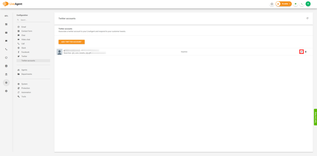 - После того, как вы подключите Twitter к вашей учетной записи LiveAgent, нажмите ‘Изменить‘, чтобы активировать аккаунт