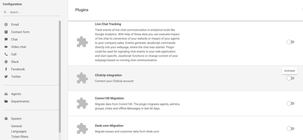 - Чтобы подключить ClickUp, войдите в систему LiveAgent и перейдите в раздел ‘Конфигурация’ > ‘Система’ > ‘Расширения’. Найдите в открывшемся списке плагин с названием ‘Интеграция ClickUp’ и нажмите на его переключатель-активатор, после чего система LiveAgent перезапустится.